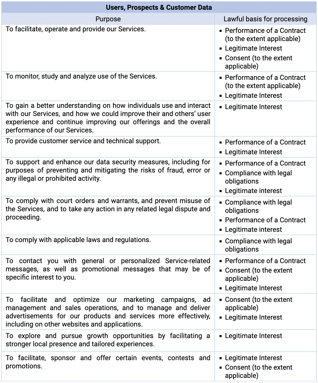 Business Customers: Our customers have access to any personal data we process on their behalf in our capacity as a “processor” or a “service provider”, as well as to personal data relating to their users, as it relates to their use of our Services.